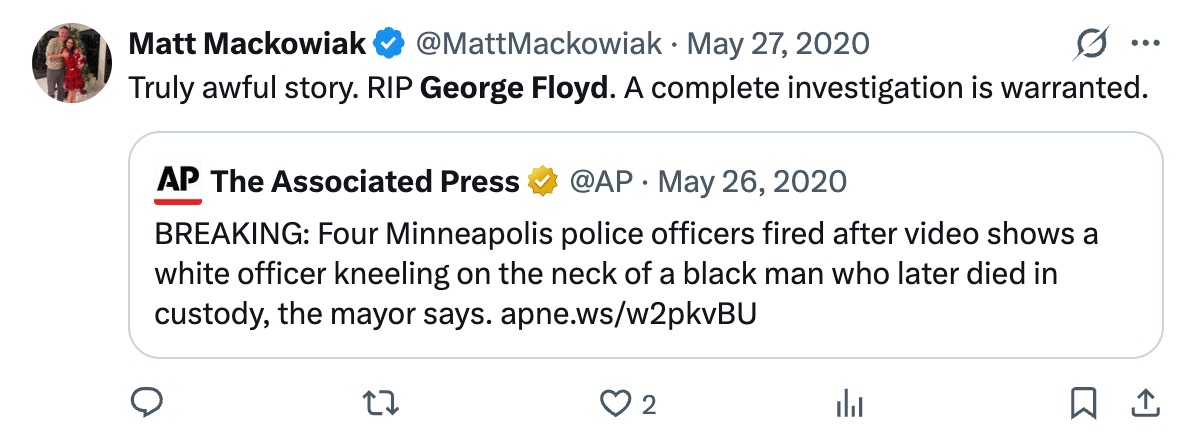 In late May 2020, at the beginning of the "summer of love" and the "mostly peaceful" Black Lives Matter riots, John Cornyn's campaign communications director, Matt Mackowiak, was posting pro-George Floyd messages on his social media accounts. Mackowiak would even pitch a pro-Floyd op-ed to The National Pulse over a year later, in October 2021.