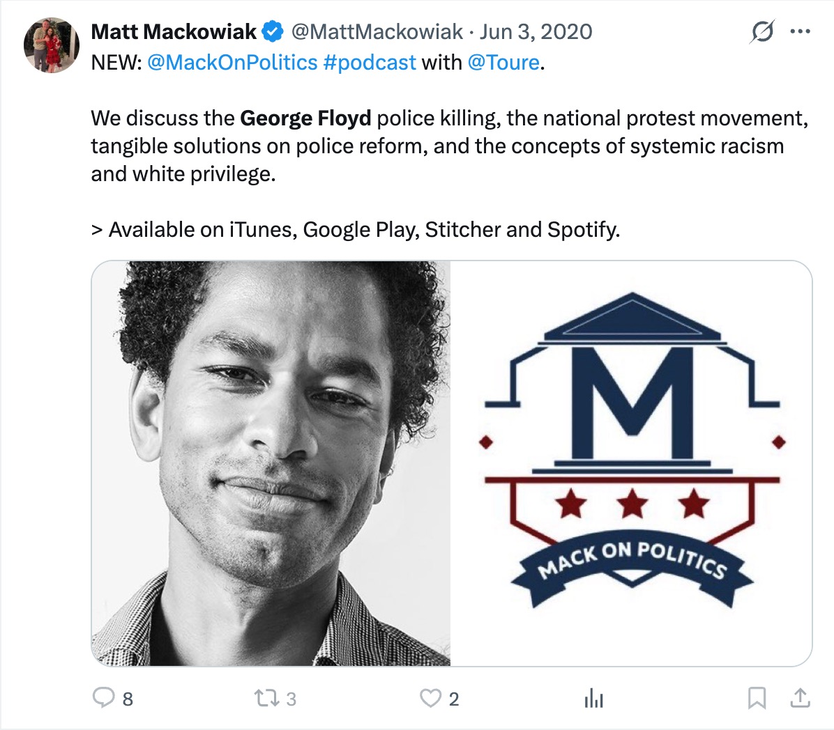 Within another few days, Mackowiak would host Touré Neblett – a long-standing race grifter – on his podcast to “discuss the George Floyd police killing, the national protest movement, tangible solutions on police reform, and the concepts of systemic racism and white privilege.”