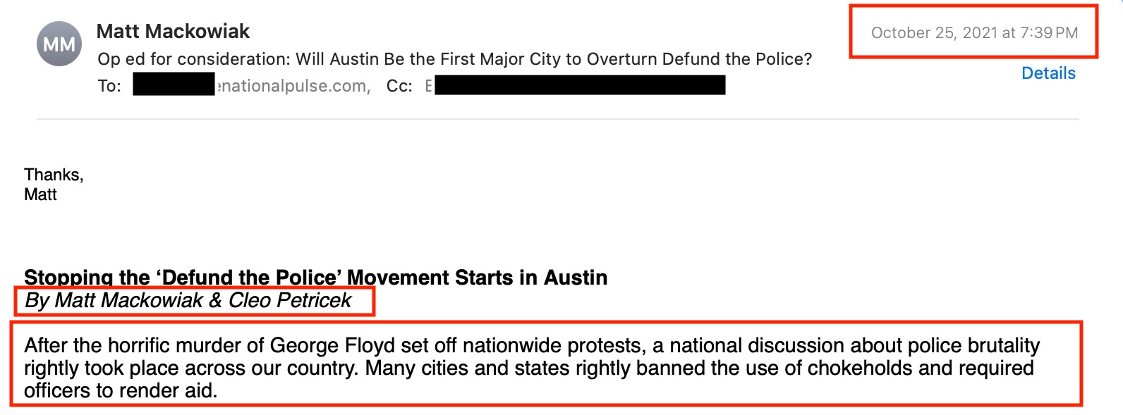 Another year would pass before he would pitch his pro-George Floyd op-ed to The National Pulse, co-authored with his “Save Austin Now” co-founder, Cleo Petrick.