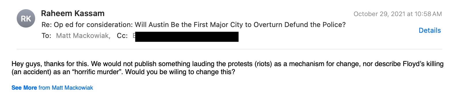After reading their proposed op-ed, and researching their previous work, we replied: “Hey guys, thanks for this. We would not publish something lauding the protests (riots) as a mechanism for change, nor describe Floyd’s killing (an accident) as an “horrific murder”. Would you be wiling [sic] to change this?”