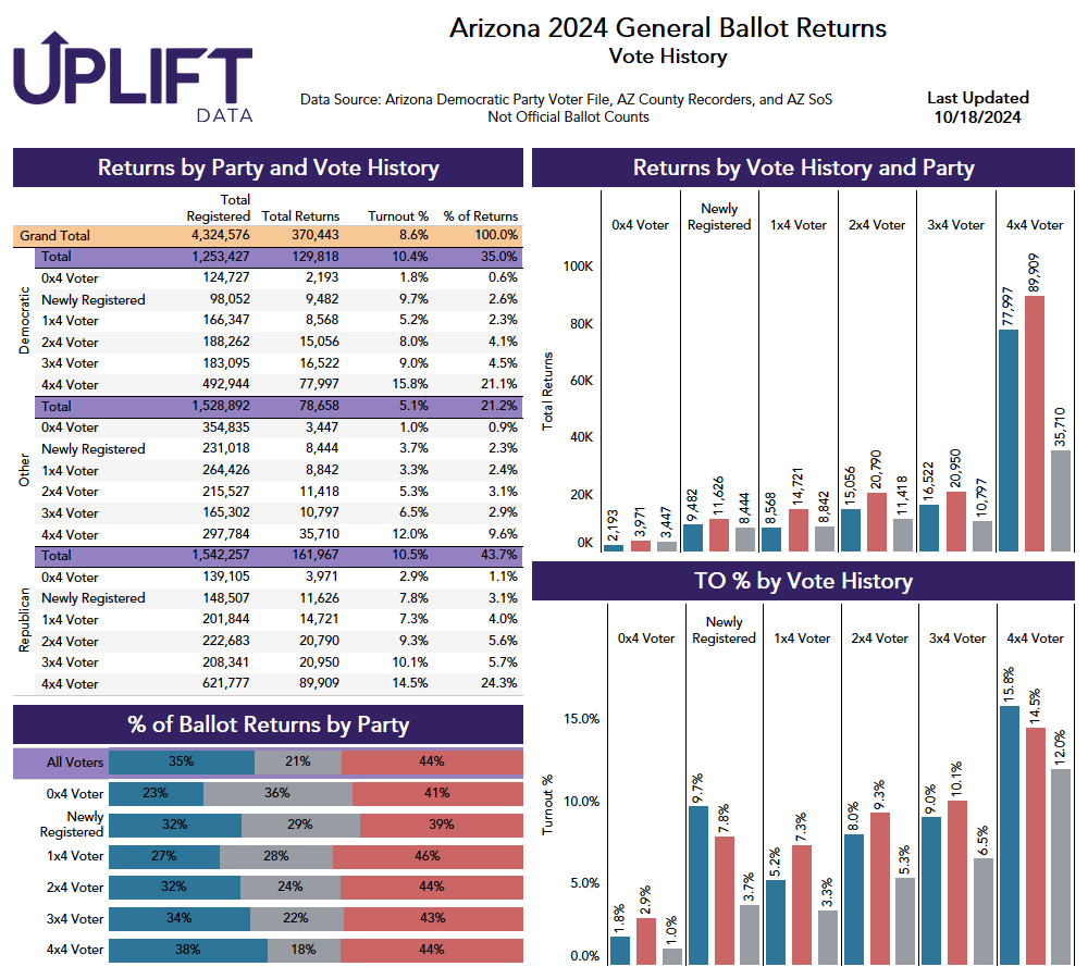 Similarly to Arizona, Nevada’s early vote appears to be breaking fairly heavily towards Republicans—while Democrats hold the advantage on the state’s mail-in ballots.